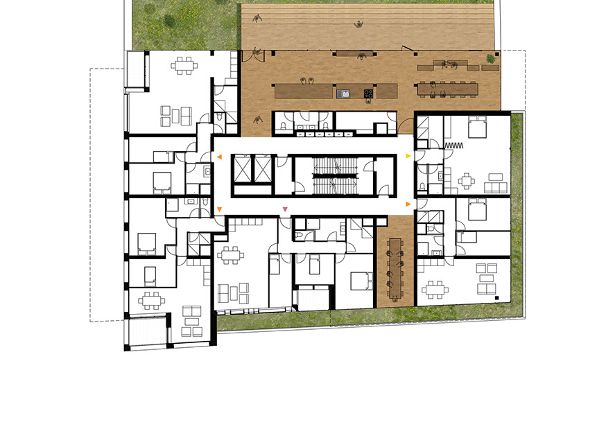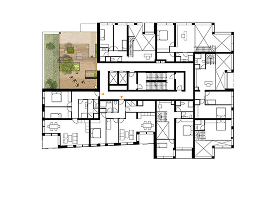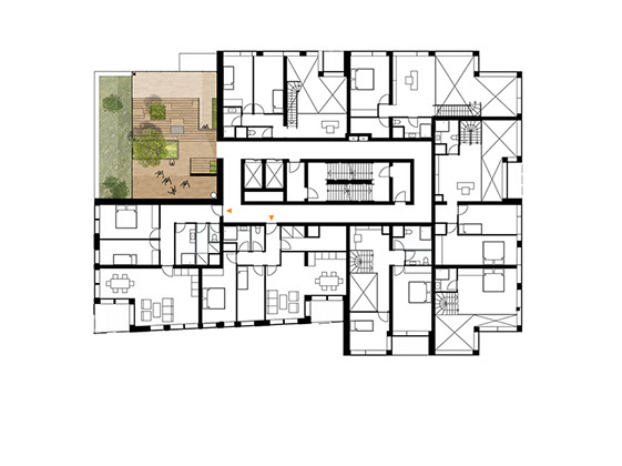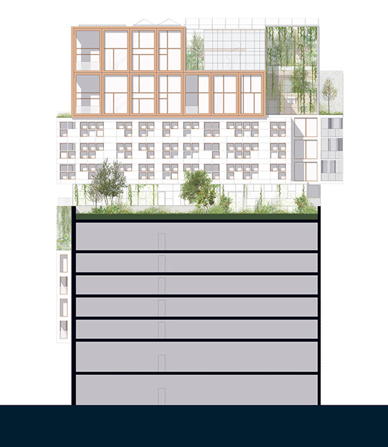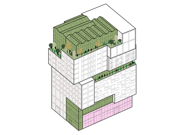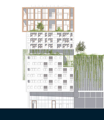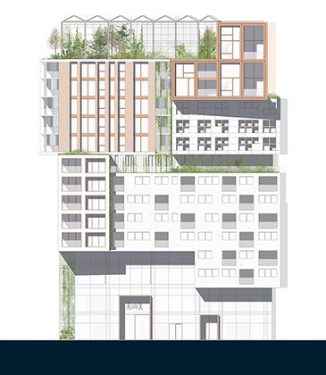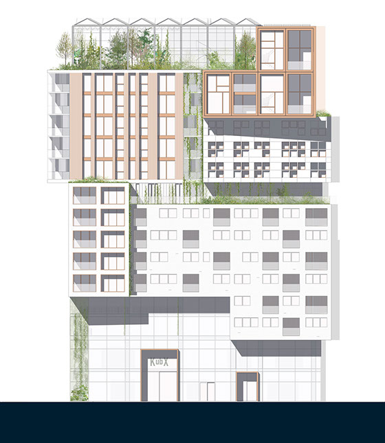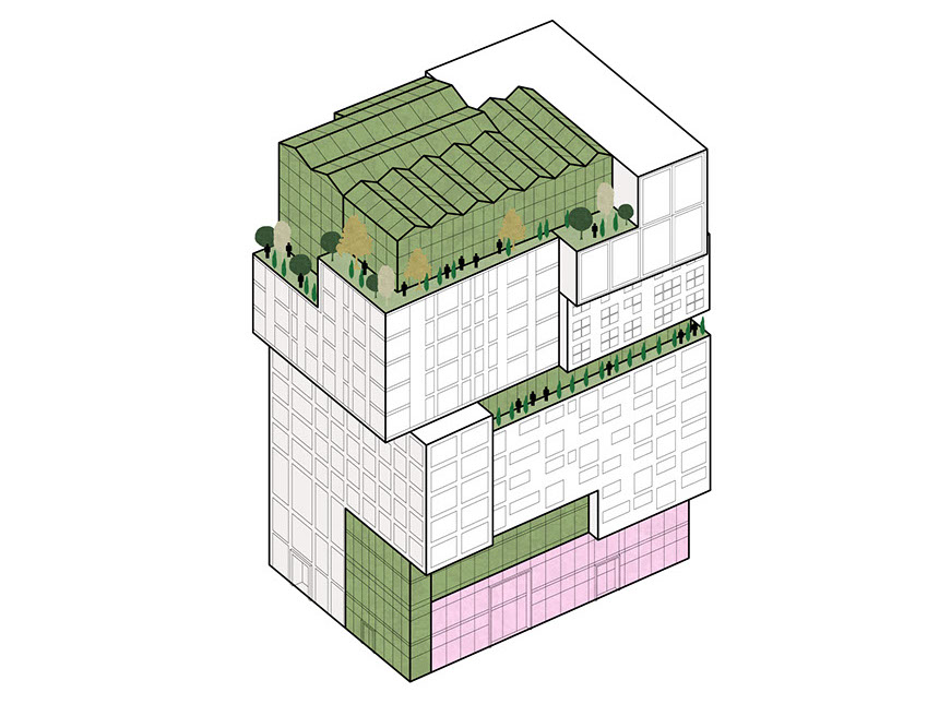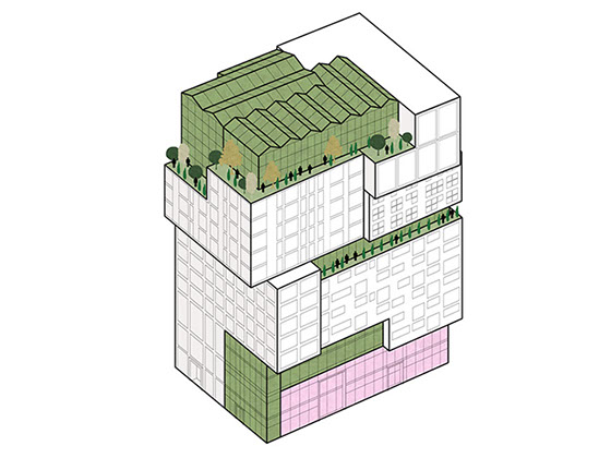Como o projeto foi desenvolvido para um grupo diversificado de utilizadores, a fachada é composta por um conjunto de blocos reconhecíveis. Cada um tem o seu próprio tipo de apartamento, embora em cada andar sempre haja uma mistura de tipos diferentes. O empilhamento desigual cria espaços livres que são usados para como corredores verdes comunitários.