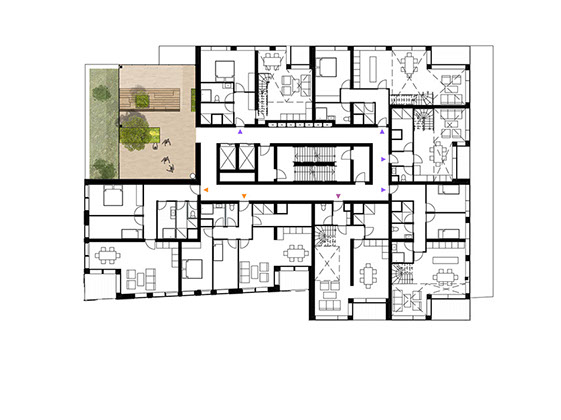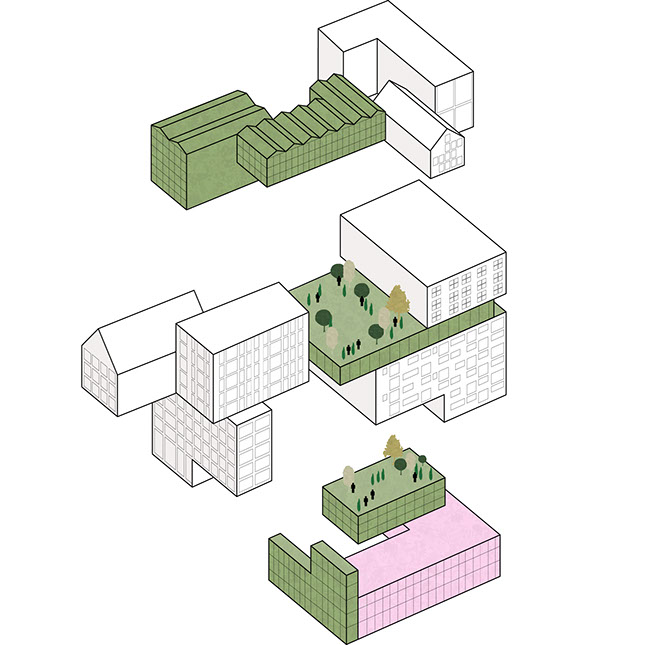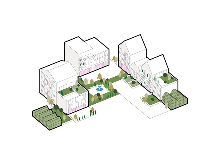 A neighbourhood is defined by an area unit with a radius of 400 meters or a 5-minute walk. A lively neighbourhood is never monofunctional, is constantly changing and offers a wide diversity of living spaces. Through the combination of ten small-scale blocks, each with its own identity and program, a micro neighbourhood is created within the lot.